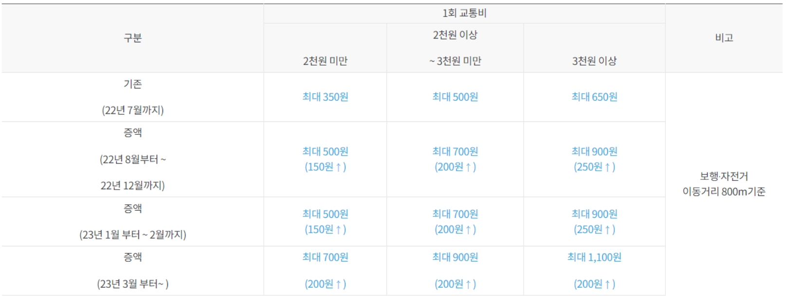 적립 금액은 이동한 거리에 비례하여 적립되며, 보행이나 자전거로 최대 800미터 이동했을 경우, 적립 횟수의 상한선은 월 60회입니다. 금액 별 적립액은 아래와 같습니다.